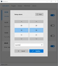 MyAlarms is a simple alarm application that is exceptionally easy to use. Just setup the alarm, minimize the application to tray and wait for your message to be shown on time.