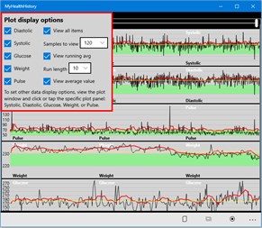 Version 4,0,1 The My-Health-History App records your systolic and diastolic blood pressure and heart pulse rate, your glucose (sugar) level, your weight, and notes from data you enter into the App. You obtain the data from your health data measuring devices. The App provides a graphical plot of the data and a statistical data graphic plot. You can use the plots to monitor the effectiveness of your medication that you can record in the notes. The App comes with sample data to aid you in learning how to use the App.