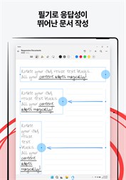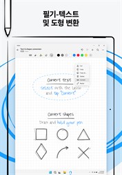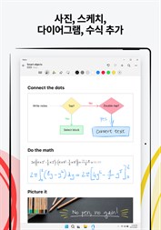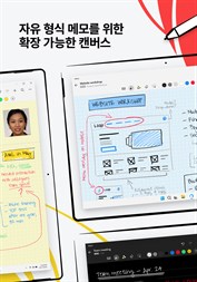 아이디어를 브레인스토밍하고 확장 가능한 캔버스에서 필기, 텍스트, 그림, 다이어그램 및 이미지를 혼합한 자유 형식 메모를 작성할 수 있습니다. 펜 제스처로 콘텐츠를 삭제 및 수정하고 필기 및 도형을 타이핑된 텍스트 및 완벽한 형태로 변환할 수 있습니다.