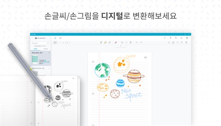 네오노트는 네오스마트펜과 호환되어 사용할 수 있는 앱입니다. 손글씨/손그림을 디지털로 변환하여 PC에 저장하고 각종 앱으로 공유하세요. (네오스마트펜으로 쓴 손글씨 노트를 디지털로 변환하기 위해서는 윈도우즈, 혹은 모바일 전용 앱과 N코드 공책이 필요합니다.)