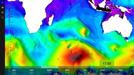 On the map, color gradient display wave heights in meter. Swipe the calendar's days in the bottom of the screen to change the display date, and you will see the storms moving like never. Animation is smooth thanks to a unique rendering technology.