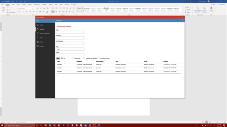 The Picture Organizer creates two methods of organizing and finding pictures. First, it creates records within a SQL database that stores the categorization of a picture into five different properties; Type, Category, SubCategory, Tags and Detail. These properties are searchable to allow the user to find relevant pictures. Second, it creates a folder hierarchy within the user’s Picture folder based on the property categories, so the pictures are organized on a hard drive in a matching order.