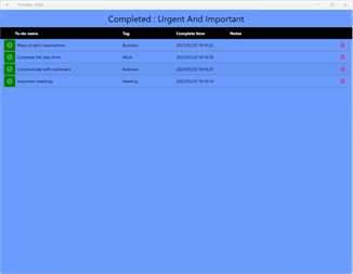 Key Features: Customize quadrant groupings to develop priority task groups that work best for you. Customize the four quadrants within each grouping to distinguish content with colors. Custom quadrant labels. You can switch quadrants to view tasks at any time. Tasks in each quadrant can be moved to other quadrants, e.g. quadrant 1 is moved to quadrant 4. Unfinished and completed tasks are displayed independently. Tasks that have already been completed can be marked as incomplete.