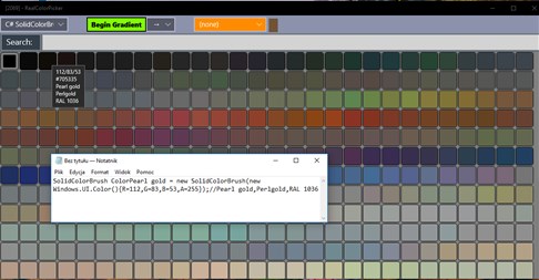 You can choose from over 2000 existing colors, and get in the Clipboard ready piece of code in c #: C# definition, SolidColorBrush, definition in XAML, XAML Brush, definition in HTML; or a small picture. Also: gradients, and transformations: Complementary, Triadic, Tetradic, Monochrome, Analogous, SplitComplementary and Square