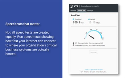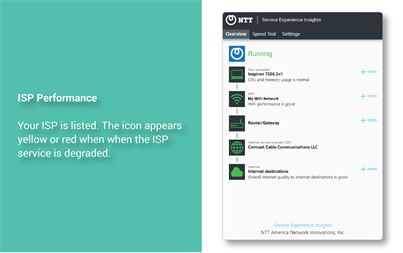 * Computer: Your CPU and memory usage and comparison metrics for other members of your team * WiFi/LAN: Latency, jitter, and loss of your local network and signal degradation and frame loss per second when connected to WiFi * Router/Gateway: Internal and external IP addresses currently in use * Internet Quality to Major Destinations: Your internet quality to major internet destinations and that of your team and other The Service Experience Insights Agents using your ISP * Speed Test: Download and upload speed to speed test targets for your organization