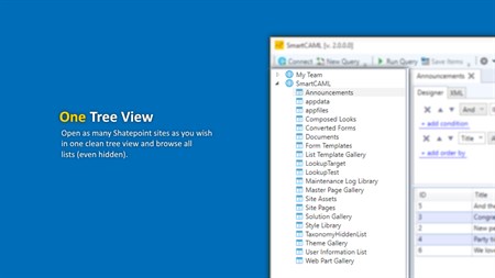 You can use this app to: - Build CAML queries, - Test your CAML queries, - Search for list items, - Update list items fields