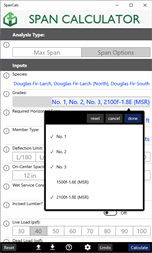 The American Wood Council (AWC) Span Calculator for Wood Joists and Rafters (Span Calc) performs calculations for all species and grades of commercially available softwood and hardwood lumber as found in the 2018 National Design Specification® (NDS®) for Wood Construction Supplement: Design Values for Wood Construction. Joists and rafter spans for common loading conditions can be determined. A span options calculator allows selection of multiple species and grades for comparison purposes.
