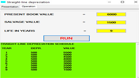 This program calculates an annual depreciation schedule based on the straight-line method. To depreciate an asset it is necessary to specify its current book value, the estimated salvage value and the life of the asset expressed in years.