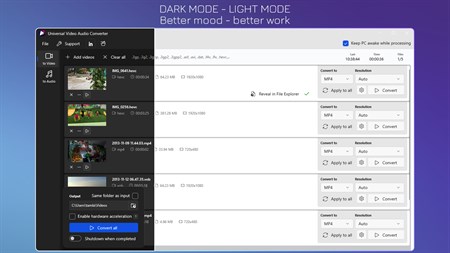 • Enable hardware acceleration to save time. • Auto shutdown when completed. • Save time with multiple files processed at once or focusing on a single video.