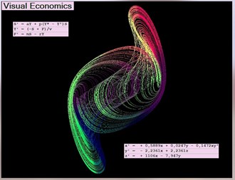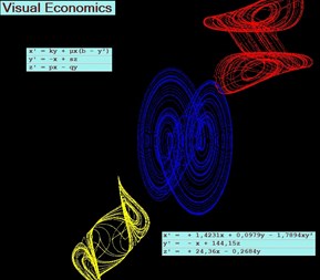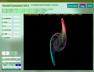 Mathematically an attractor is a value or set of values toward which variables in a dynamical system tend to evolve. In the examples in VISUAL ECONOMICS you may change the coefficients of the concerning ODE system by using of scrollbars. Meanwhile, it can be observed how the attractor changes. When using scrollbars, you change the coefficients of the ODE system (that is, the parameters of the economic process), and the shape of the attractor changes. The shape and dynamic behavior of the attractor allow conclusions about the stability and characteristics of the economic process.