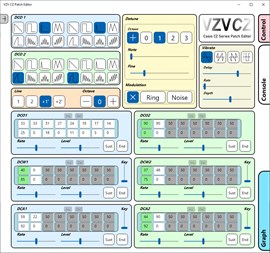 VZV CZ can load and save standard MIDI sysex files (*.syx) which are CZ compatible. It can read patches from both the synth's patch memory and "live" patch (the current sound), send patches to the "live" patch and edit every patch parameter. Sysex data is displayed as hexadecimal for copying and pasting in the VZV CZ Console. User patch sets of 16 patches can be created and saved as .syx Sysex files. Sysex data is always saved to file as the default Channel 1 and is then routed to the current MIDI channel selected in VZV CZ.