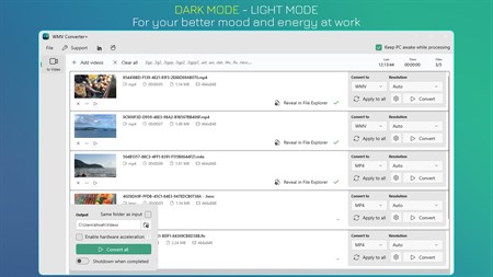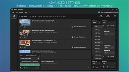 • Enable hardware acceleration to save time. • Auto shutdown when completed. • Save time with multiple files processed at once or focusing on a single video. • Keep PC awake while processing.