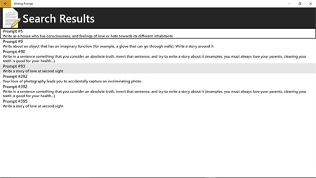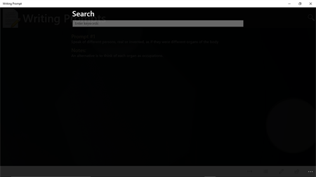 The app integrates a series of 300 writing prompts that are deliberately different in their scope; some are straightforward theme suggestions, others are hint ideas about the style, structure or tone you can use, and there are even word games you can experiment with. However, what all of them have in common is that they intend to be wide and open enough to allow different interpretation, so different writers can profit from them without having their personal style and artistic preferences compromised. The mission of this app is helping you put the "creative" in "creative writing".