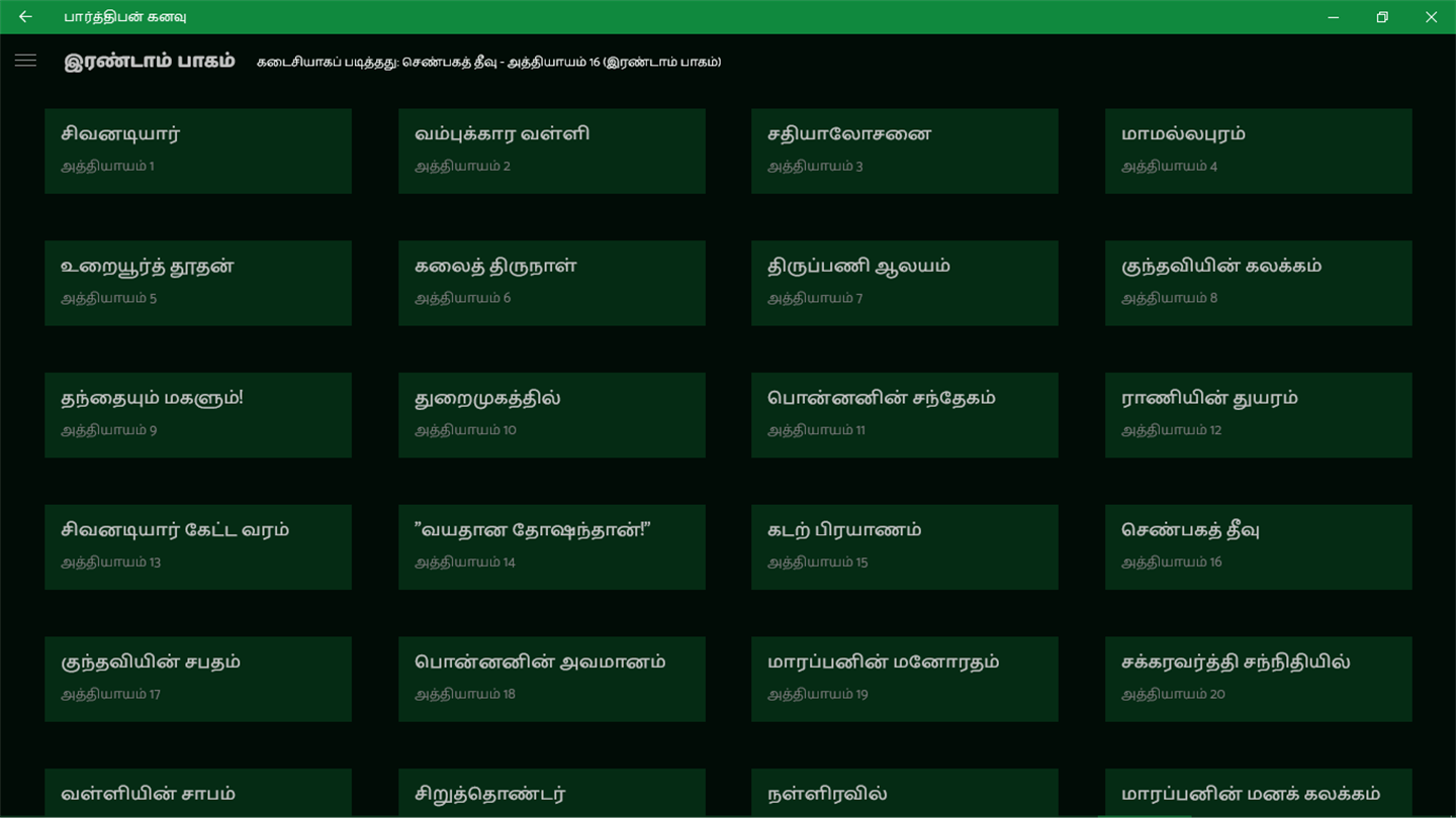 I hav read ponniyin selvan , sivagamiyin sabadham , this too...... vry nice I luvd it but I request to intro many app like udaiyar (which is a sequel of ponniyin selvan) nice app......thank u.......