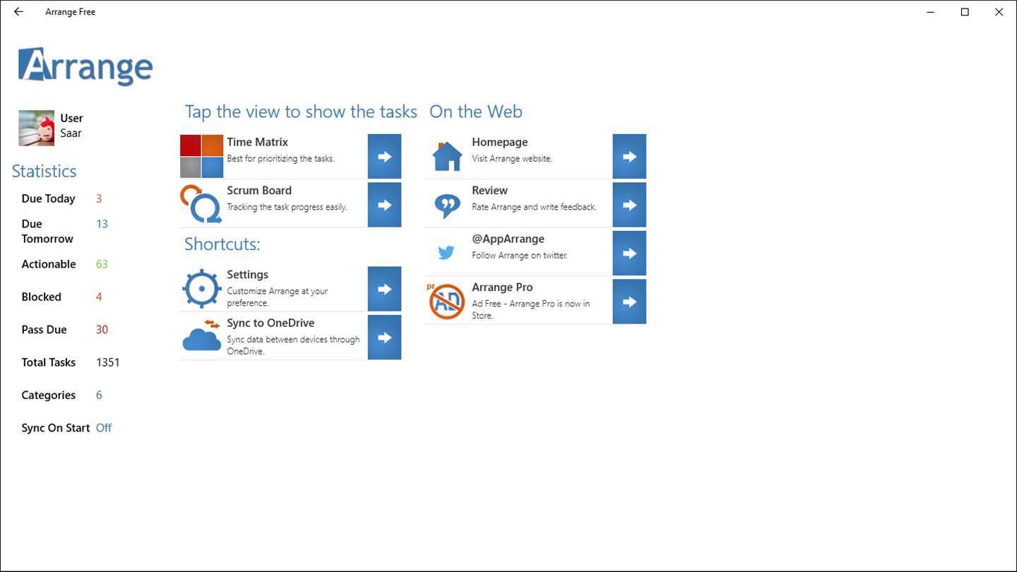 I like how it's set up with things that are in progress, need to start, and finished sections. It would be nice to have an option to color coordinate the different sections so when you view 'All' in the main screen, then it would be easier to differentiate the separate sections. Also, have it easier and quicker to create a task. Like maybe just add a popup window next to the cursor in the view screen