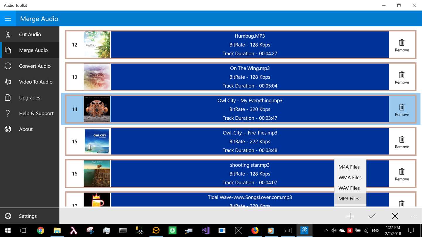 First of all, I want to complement the vendor for his extremely quick responses in regards to my issues with his product. That is the reason for the two stars. The reason I did not provide additional stars in the rating is the following issue: Under the shopping bag icon, there is a “Merge Tracks” icon. When you click on it, it states, “Merge several audio files as a single track. Save the file after merging with out any copyright content, want to upgrade now?” I paid for this feature because I interpreted it to mean the program would merge several audio tracks running in parallel. It does not do this...it only connects them serially. The second inference is the copyright statement should no longer be appended to the end of my recordings (this understandably applies to the free version but after paying them the copyright statement should no longer be included). That is also incorrect as I still keep getting these statements showing up which has been extremely annoying.