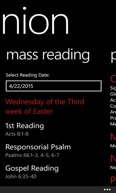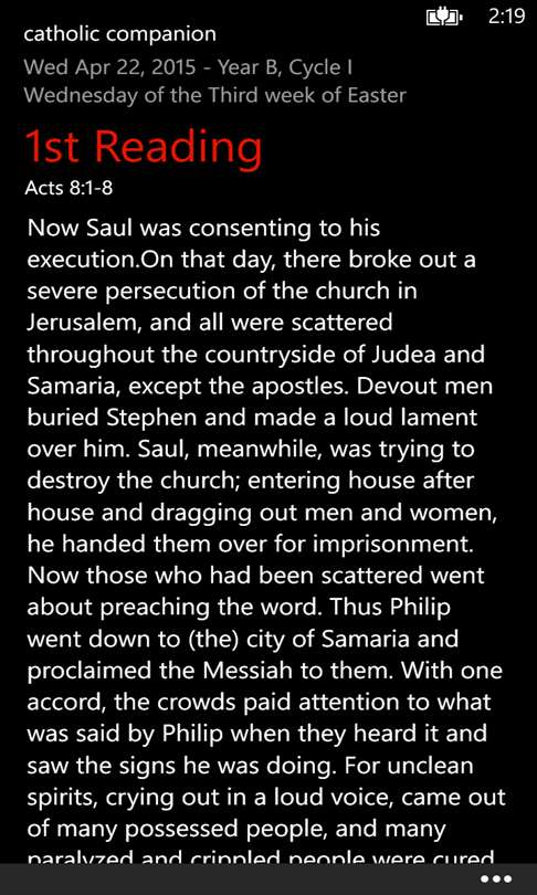 3-5-15 update: Finally can choose a date for reading In addition, I believe font was changed. Looks really good! --- I'm quite impressed with this app! I've used two other popular Catholic apps and I think this sums down to what I really want - prayers and the daily Bible readings. Simple and organized view! Great work! Initially, two items are missing that I hope get added: 1. A way to contact the developer for ideas and feedback, and 2. A "Home" shortcut, maybe in the ellipsis menu.