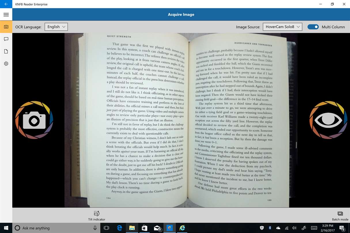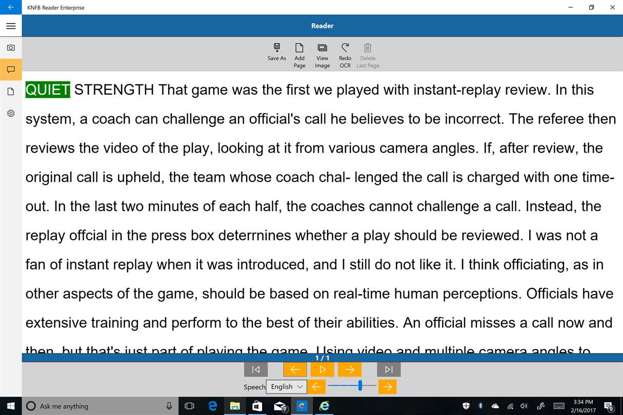 Ok, at $19.99 for a limited time, I’ve very impressed and even at $99 for the regular price with a $100 Canon LIDE 210 flat bed scanner, this would be a very good alternative for an average user needing basic OCR scan and read. I tested this with a Canon LIDE 210 flat bed Canon scanner and the internal HP web cam on my HP laptop. The scanner accuracy and speed was very good with comparable speed and accuracy with OpenBook. With the WebCam, I found good results without needing the scanner but positioning the page to be scanned was difficult and my webcam has no flash. This would be likely a better option on a Surface Pro or Windows phone with a flash. This would be ideal for our casual user with a L.D. or Visual Disability needing easy OCR using Windows 10. I’ve long used the KNFB Reader on the iPhone with very good results. Users needing advanced tools and features would still possibly need either the full Kurzweil or OpenBook programs but KNFB reader is a much cheaper alternative.