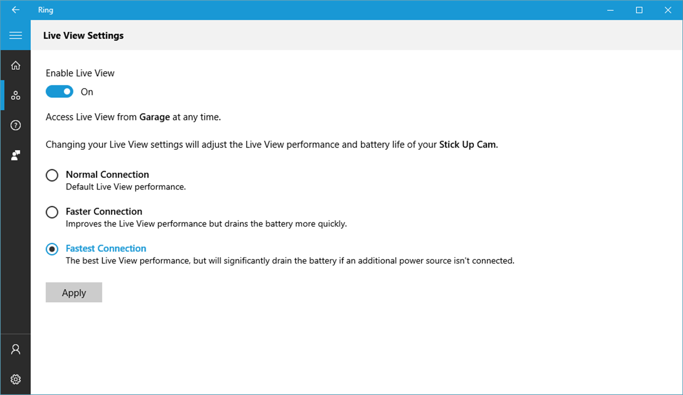 I like Ring products but the Windows 10 app seems left out a lot. Currently it does not support the features of the flood light cam. I like not always having to get my phone out to check things. Wish they would keep the Windows 10 app as current as the iOS and Android apps.