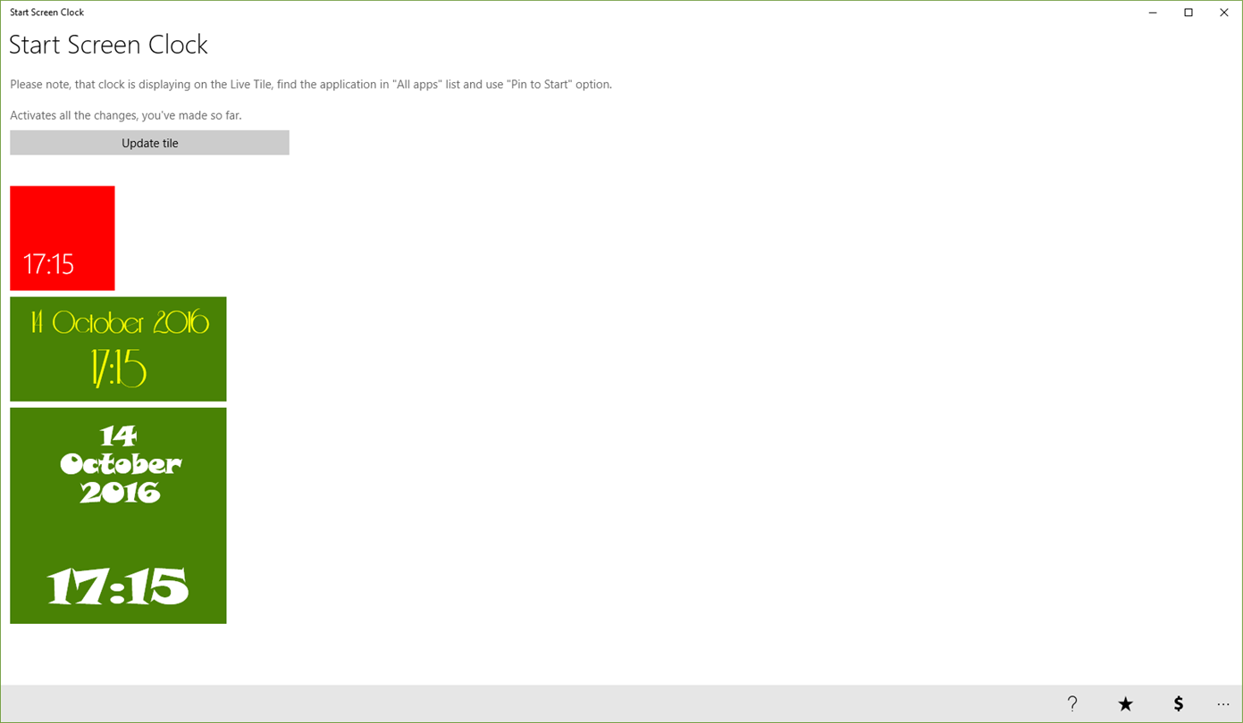 I have been using this app for years on Windows Phone and then in Windows 8, and finally here we are in Windows 10, it got updated a while back to be a fully universal windows app and everything got better. This app is still the best for doing it's job, it displays a nice big clock telling me the time and not only that but now it can also do the date. By default you only get one font, numbers are crisp and look good on any device, you can change the color (background and text color) or you can just use your accent color( and still change text color!) if you want more fonts, you can donate to get a huge variety of fonts to work with, and it's definitely worth it, it's not pricy and the guy deserves it. Why? This is one of the few developers that maintains his app and keeps it functional, while others unfortunately make a quick buck and abandon their app. For keeping his app alive I give him huge props, thank you for still supporting the app. 5 well deserved stars.