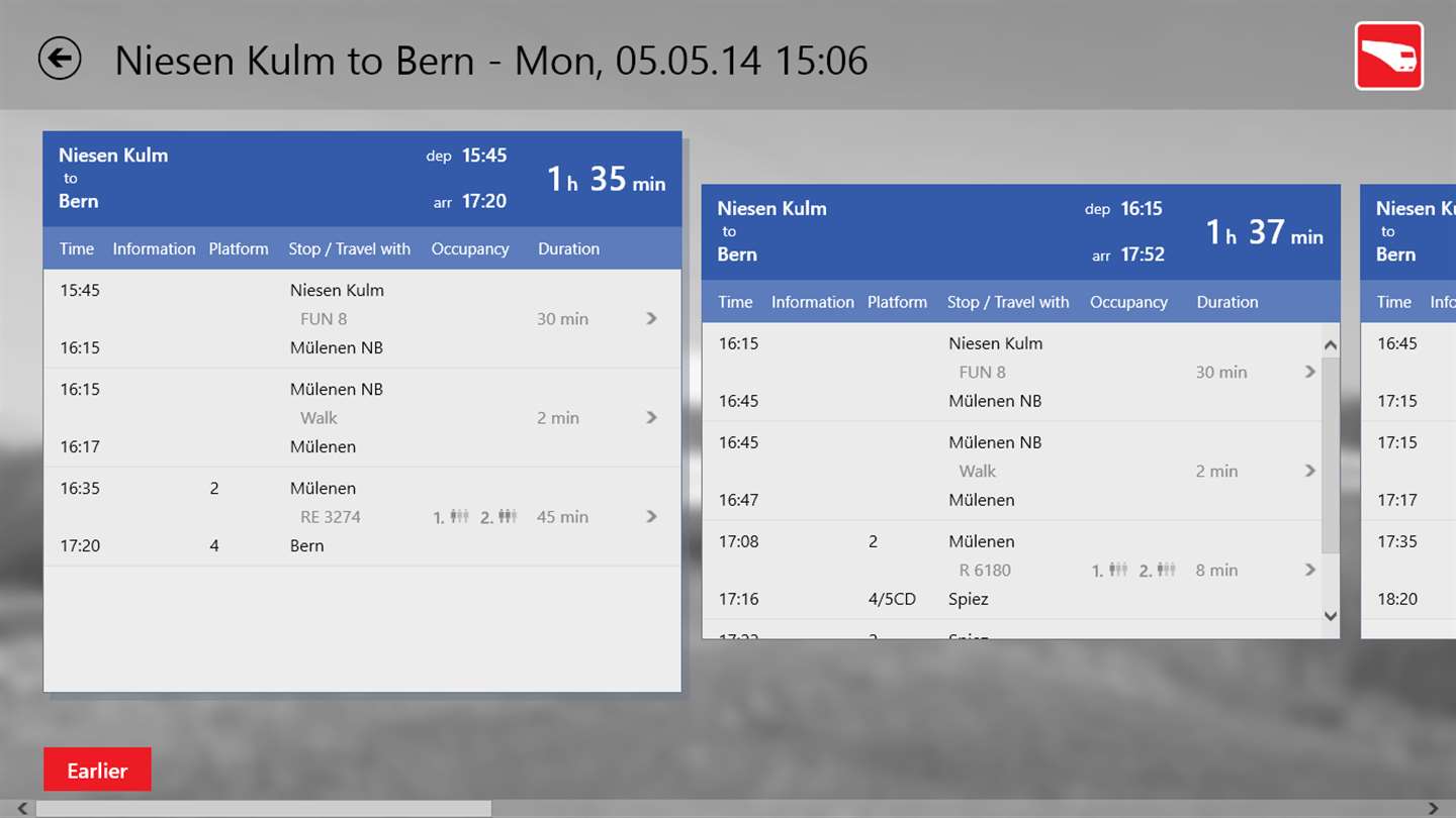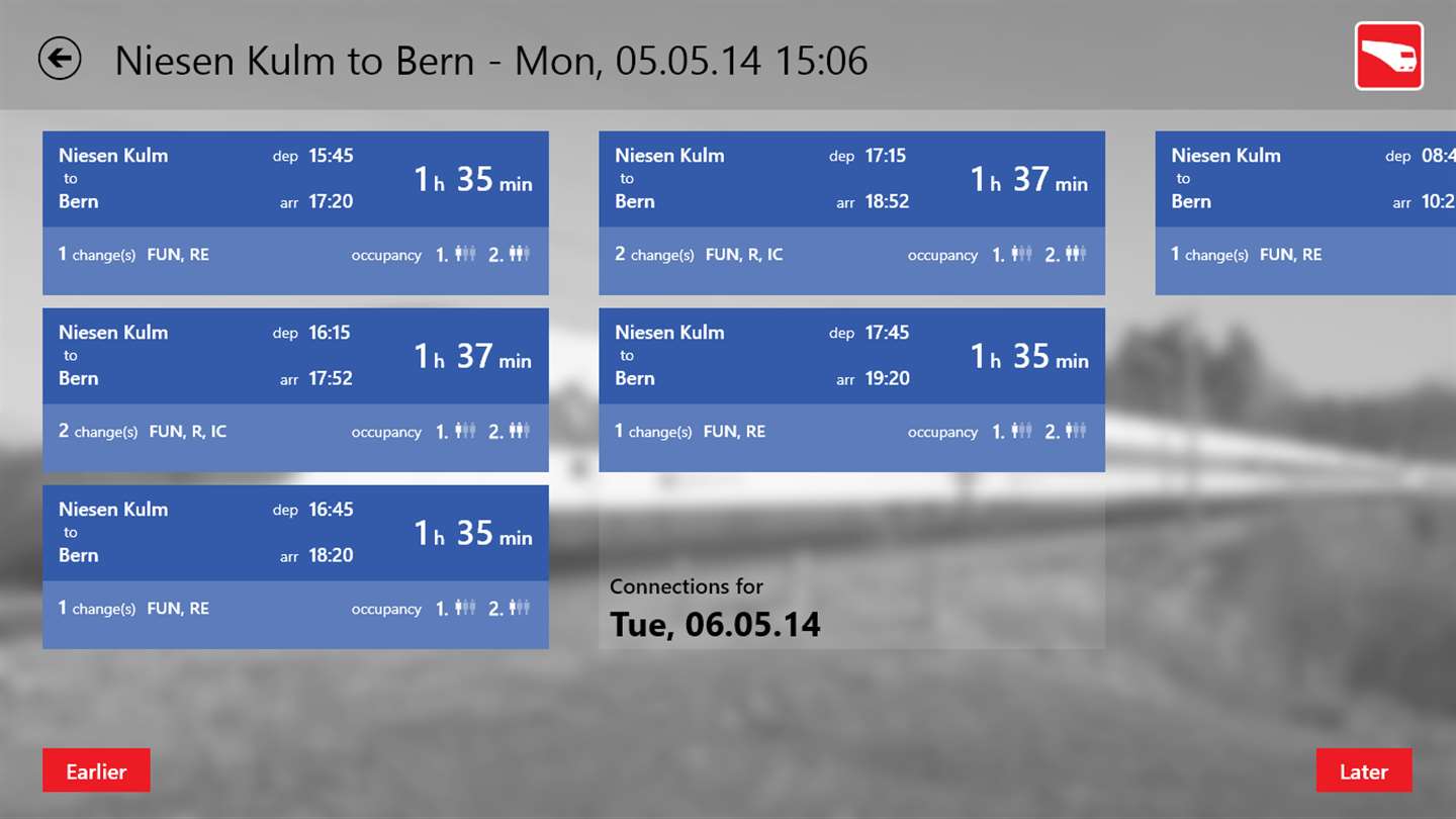 Very useful app! I just wish it would keep recently used schedules in its memory (or put a "save search" option), so you can use it when you're offline. In fact, wouldn't it take just a few MB to download all schedules for Switzerland. That would be SO useful!