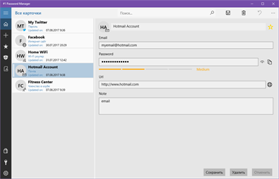 Функции #1 Password Manager (бесплатного менеджера паролей): - Локальное защищенное хранилище паролей (Приложение не использует сервера или общие диски на интернете, о которых нужно беспокоиться) - Расширенная защита безопасности с использованием передового опыта и стандартов безопасности - Алгоритм Advanced Encryption Standard (AES) / Rijndael с 256-битным ключом, который обеспечивает конфиденциальность и безопасность данных - #1 Password Manager (бесплатный менеджер паролей) никогда не имеет доступа к вашему ключу шифрования и защищает его с помощью главного пароля, который хэшируется с использованием алгоритма Sha512 - Функции резервного копирования и восстановления, которые позволяют пользователям архивировать (сохранять) и извлекать пароли из файла резервной копии - Современный интуитивно понятный пользовательский интерфейс (UI), разработанный с использованием лучших рекомендаций для UWP приложений - Способ организации паролей, логинов и других записей по категориям и типам - Быстрый поиск по всем записям и отдельному списку «Избранное» для ваших наиболее часто используемых записей - Возможность сортировки записей по датe созданния / измененния или названию - Функция копирования и вставки, которая позволяет быстро создавать и публиковать новые записи - Возможность изменить свой главный пароль - Генератор Паролей позволяет создать новые случайные, но прочные, сложные и надежные пароли (passwordgen/генератор паролей) - Проверить прочность пароля - Безопасное хранение всех ваших имен пользователей, паролей и личных данных на локальном устройстве - Конфиденциальные данные всегда хранятся в зашифрованном виде на диске устройства - Повышенная безопасность, которая блокирует доступ к приложениям после некоторого времени неактивности - Бесплатный Диспетчер Паролей