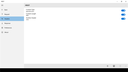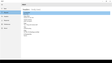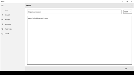Features: - Make GET, POST, PUT, DELETE, OPTIONS and HEAD requests. - Set request headers and display response headers. - Based on Universal Windows Platform. You can install it on any device running Windows 10. Upcoming Features: - Save, export and import requests - Prettify response