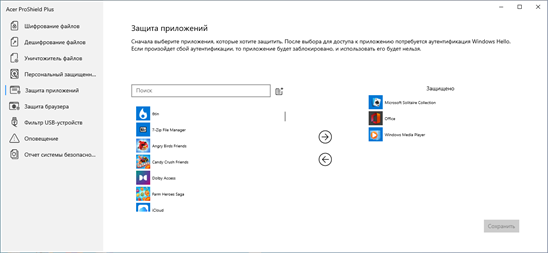 Защита приложений Вы можете выбрать приложения, которые нужно защитить. После выбора для доступа к приложению потребуется аутентификация Windows Hello. Если произойдет сбой аутентификации, то приложение будет заблокировано, и использовать его будет нельзя.
