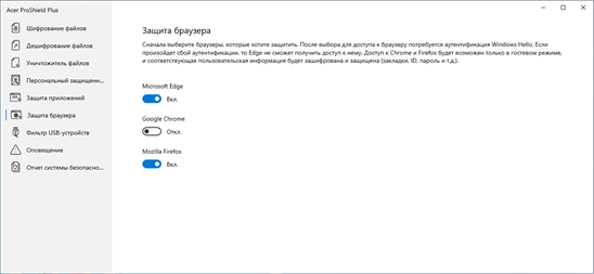 Защита браузера Сначала выберите браузеры, которые нужно защитить. После выбора для доступа к браузеру потребуется аутентификация Windows Hello. Если произойдет сбой аутентификации, то Edge не сможет получить доступ к нему. Доступ к Chrome и Firefox будет возможен только в гостевом режиме, то есть соответствующая пользовательская информация будет зашифрована и защищена (закладки, ID, пароль и т.д.).