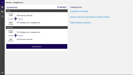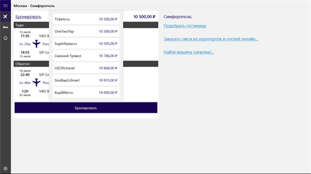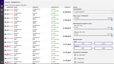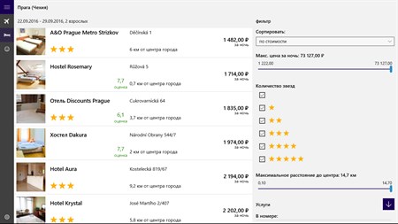 Выполняйте поиск нужного вам авиабилета или отеля из огромного количества предложений. Вы можете отбирать и сортировать авиабилеты и предложения отелей по множеству параметров – цене, длительности перелета, количеству и времени пересадок, количеству звезд и т.д. Получайте полную информацию о перелете, включая тип самолета. Смотрите фотографии отелей и их положение на карте.