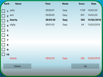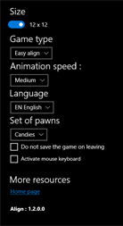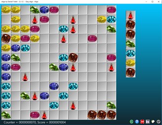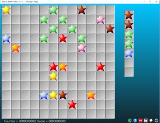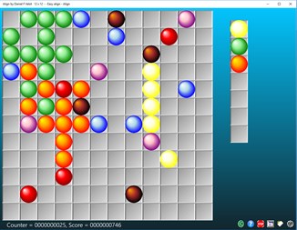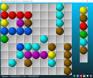 Цель Align Game состоит в том, чтобы устраивать одинаковые цветовые шары в прямом выравнивании из пяти (или более), в то время как три-семь новых шаров появляются на каждом шагу. Чтобы начать играть, вам нужно переместить мяч (выберите один мяч (щелкните по мячу) и переместите его в самое удобное место (нажмите на целевой квадрат)). Шары могут быть выровнены в любом из четырех направлений (вертикальные, горизонтальные и диагональные). Выравнивание 5 или более шаров одного цвета устраняется, добавляя к результату. Эта настольная игра обеспечивает четыре режима воспроизведения: 1 - нормальный без посторонней помощи. 2 - нормальный с шарами Джокер (действителен для любых цветных линий). 3 - eazy: игра удачно размещает мячи на существующих линиях. 4 - помощь в группировке одинаковых цветов. Используйте клавишу Inser для активации или остановки эмуляции мыши. Эта версия включает семнадцать переводов (немецкий (Германия), английский (США), арабский (Саудовская Аравия), Бангладеш (Бангладеш), Китайский (Китай), испанский (Испания), французский), хинди (Индия), венгерский (Венгрия ), Итальянский (Италия), японский (Япония), малайский, голландский (Нидерланды), норвежский (bokmål) (Норвегия), португальский (Португалия), русский (Россия), шведский (Швеция)).