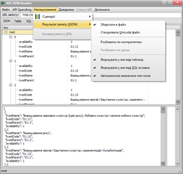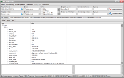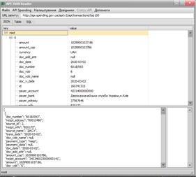 API JSON Reader - программа, которая упрощает работу с открытым API (версия 2.0) Единого веб-портала использования публичных средств spending.gov.ua. Программа автоматизирует поиск транзакций и договоров в API Spending по одному или нескольким контрагентам (плательщик / получатель): - содержит справочники сервера API Spending Единого веб-портала использования публичных средств; - формирует удобное для просмотра дерево JSON файла; - автоматически сохраняет полученные JSON файлы в кодировке UTF и Unicode; - автоматически разбивает результат запроса по контрагентам (если это требуется); - транслирует JSON файл в таблицу, которую можно экспортировать в Excel или в другой редактор; - формирует из JSON файла SQL запрос для вставки данных, например в таблицы MySQL, TransactSQL или MS SQL Server; - позволяет создавать и сохранять «сценарии» - повторяющиеся запросы поиска данных, которые можно запустить на выполнение одним кликом по названию сценария; - позволяет открывать ранее созданные JSON-файлы для удобного просмотра в виде дерева или таблицы (+ экспорт в Excel); - есть возможность поиска (по ЕГРПОУ или названии) общей информации по контрагенту, используя сервер API-доступа к открытым данным Единого государственного реестра юридических лиц edr.data.gov-ua.org.