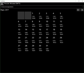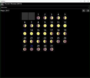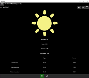 Солнечный и лунный календарь на день и месяц. Отображает время восхода и захода солнца, гражданские навигационные и астрономические сумерки, долготу дня. Время восхода и захода луны и ее фазу. Даты новолуния и полнолуния. Автоматическое определние местоположения и часового пояса (необходимы включенная функция Геопозиции и доступ к сети Интернет для определения населенного пункта). Можно настраивать свои местоположения по координатам и часовому поясу.