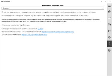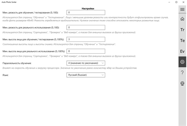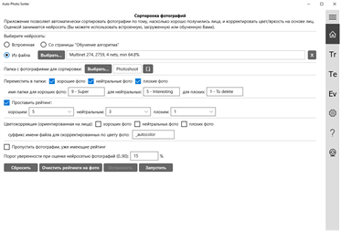 Характеристики: - Автоматическая сортировка посредством установки рейтинга фотографиям и/или перемещения их в спец. папки, - Оценка производится нейросетью. Есть встроенная, но можно также легко обучить и свою, - буквально наполнив 2 папки "хорошими" и "плохими" фотографиями и нажав 1 кнопку, - Настройка минимального размера лиц позволяет выбрать степень "портретности" фотографий, - Автоматическая коррекция яркости и цвета с сохранением в отдельные файлы, - Оценка видеопотока с вебкамеры и съёмка фото в лучшие моменты, - Поддержка внешнего вызова из других приложений: Вы можете создать своё, которое будет оценивать фото для Ваших задач, передавая настройки, нейросеть и фотографии и получая результат (код с примером внутри), - Поддержка jpg, jpeg, png, cr2 и nef файлов; если RAW файл имеет то же имя, что и jpeg, то будет проанализирован только последний ради скорости. Это удобно, когда Вы снимаете одновременно в RAW и jpeg.