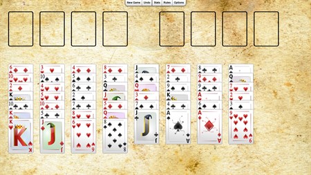 Baker's Game is actually the stricter mother of the much more popular Freecell solitaire. The layout is the same, and the foundations are still built up from Aces to Kings in suit. Free slots can be filled by any card, and any pile in series can be moved as long as there are enough free cells and/or tableau openings. The twist is that stacks are built downwards in rank and suit, so you must plan much more carefully and be a bit luckier to free up slots in this game. Because of this, although harder, winning a game of Baker's Game feels extremely rewarding compared to Freecell.