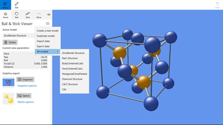 With Ball & Stick app, you can • Compose your original ball & stick models by inputting (or importing) data, • Rotate or zoom the model intuitively on screen to inspect geometry of the structure, and • Export graphics to make materials that you can use in your papers or presentations or for education, etc.