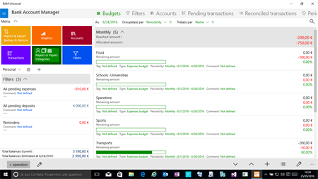 - Manage any number of bank accounts - Full Backup & restore with backup sets manegement - Import from QIF and OFX - Export to CSV, HTML, XML, QIF - Payment types and currency configurable per account and per transaction - Enter in few seconds and very easily your new payments and deposits with default category and budget, Payee/Payer, comment, currency and payments types selection - Manage periodic payments and incomes with periodicity type and frequency configurable. - Manage the currency of bank accounts and pending transactions with automatic rates retrieval. - Configurable categories (Home, Food, Transport, Schools, Taxes, etc…) - Configurable budgets - Configurable Payee/Payers and currencies used - favorite transactions support - Forecast very easily the balances of all accounts in next few days, weeks, or months - Option to enable a password - Photo Attachment and location detection - Multiple profiles support (personal, professional, etc...) - Etc..