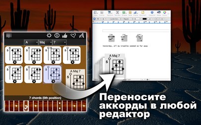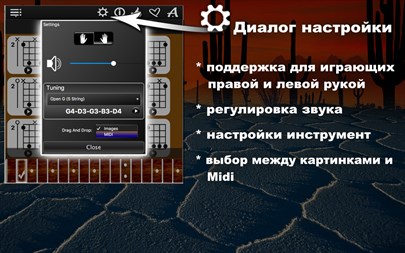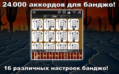 Banjo Chords Compass влючает в себя: - Число аккордов: 24.000. - С помощью Drag&Drop Вы сможете перенести нужные Вам аккорды и сохранить их в своих музыкальных cборниках. - Уникальная возможность прослушивать каждый аккорд на экране. - Поддержка 56 типов аккордов: Maj, Maj 6, Maj 7, Maj 9, Maj 11, Maj 13, Maj Maj7, Maj Add9, Min, Min 6, Min 7, Min 9, Min 11, Min 13, Min Maj7, Min Add9, Dim, Dim 6, Dim 7, Dim 9, Dim 11, Dim 13, Dim Maj7, Dim Add9, Aug, Aug 6, Aug 7, Aug 9, Aug 11, Aug 13, Aug Maj7, Aug Add9, Sus2, Sus2 6, Sus2 7, Sus2 9, Sus2 11, Sus2 13, Sus2 Maj7, Sus2 Add9, Sus4, Sus4 6, Sus4 7, Sus4 9, Sus4 11, Sus4 13, Sus4 Maj7, Sus4 Add9, 5, 5 6, 5 7, 5 9, 5 11, 5 13, 5 Maj7, 5 Add9, - Звук настоящего банджо. - Приложение поддерживает все распространённые виды настроек: 1. Open G (5 String), 2. Standard C (5 String), 3. Open D (5 String), 4. Old-Time D (5 String), 5. Open A (5 String), 6. Plectrum (4 String), 7. Chicago (4 String), 8. Tenor (4 String), 9. Open C (5 String), 10. Double C (5 String), 11. Sawmil (5 String), 12. Guitar (5 String), 13. Willie Moore (5 String), 14. Doc Bog's D (5 String), 15. Cumberland Gap (5 String), 16. G Minor (5 String), - Поддержка для левшей, - Регулируемая громкость.