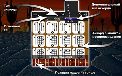 БЕСПЛАТНО пробуйте 1 день! Найдите идеальные аккорды для своих пьес на банджо! Благодаря специально разработанному алгоритму, Banjo Chords Compass сможет Вам показать все возможные аккорды во всех 17 позициях. Для этого выберите основу аккорда слева, тип аккорда в центре и дополнительный тип справа. И начинайте играть!