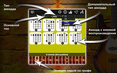 БЕСПЛАТНО пробуйте 1 день! Найдите идеальные аккорды для своих пьес на бас-гитаре! Благодаря специально разработанному алгоритму, Bass Chords Compass сможет Вам показать все возможные аккорды во всех 17 позициях. Для этого выберите основу аккорда слева, тип аккорда в центре и дополнительный тип справа. И начинайте играть!