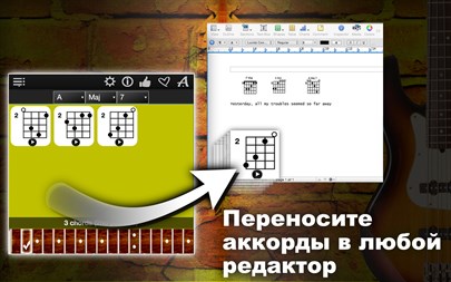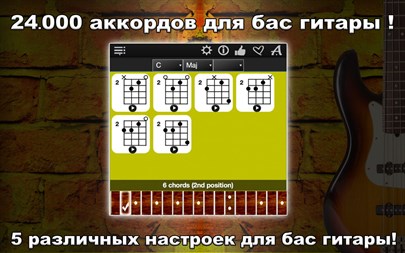 Bass Chords Compass влючает в себя: - Число аккордов: 24.000. - Уникальная возможность прослушивать каждый аккорд на экране. - С помощью Drag&Drop Вы сможете перенести нужные Вам аккорды и сохранить их в своих музыкальных cборниках. - Поддержка 56 типов аккордов: Maj, Maj 6, Maj 7, Maj 9, Maj 11, Maj 13, Maj Maj7, Maj Add9, Min, Min 6, Min 7, Min 9, Min 11, Min 13, Min Maj7, Min Add9, Dim, Dim 6, Dim 7, Dim 9, Dim 11, Dim 13, Dim Maj7, Dim Add9, Aug, Aug 6, Aug 7, Aug 9, Aug 11, Aug 13, Aug Maj7, Aug Add9, Sus2, Sus2 6, Sus2 7, Sus2 9, Sus2 11, Sus2 13, Sus2 Maj7, Sus2 Add9, Sus4, Sus4 6, Sus4 7, Sus4 9, Sus4 11, Sus4 13, Sus4 Maj7, Sus4 Add9, 5, 5 6, 5 7, 5 9, 5 11, 5 13, 5 Maj7, 5 Add9, - Звук настоящей бас-гитары. - Приложение поддерживает все распространённые виды настроек бас-гитары: 1. Standard (4 String), 2. Standard (5 String), 3. Standard (6 String), 4. Tenor (5 String), 5. Alternative (6 String), - Поддержка для левшей. - Регулируемая громкость.