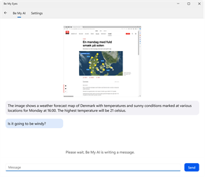 Be My Eyes for Windows brings you Be My AI, a pioneering tool that provides detailed AI-powered descriptions of images and graphics, along with an interactive chatbot, for a more accessible computer experience. Here's just some of the things Be My AI can do for you: 1. Describe your screen Let Be My AI instantly describe what is on your screen, within a window, or other on-screen content. Whether you're browsing websites, using applications, or exploring documents, Be My AI provides accurate and detailed descriptions. 2. Describe local images Bring images stored on your computer to life with Be My AI's image description functionality. Clear, concise descriptions of locally stored images and graphics opens up a new world of possibilities. 3. Describe online images Use Be My AI to get visual information of online pictures and content. Just copy to your clipboard, and let Be My AI generate a detailed text description. 4. Prepare for video calls Be My AI can assist you in preparing for a video call. It can tell you if you are centered in the frame, or what your background looks like. Simply take a picture with the built in laptop camera or external camera and get ready for online calls. Be My AI also lets you ask follow-up questions about the descriptions it provides. Please note this app is intended only for the use of people who are blind or have low vision. If you are sighted and wish to volunteer at Be My Eyes, please download our mobile app. Be My Eyes for Windows is currently in beta and will continue to be improved with enhancements and new features.