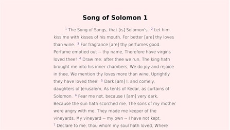 Список доступных переводов:* YLT, Young's Literal Translation (1898) * KJV, King James Version 1769 with Apocrypha * NKJV, New King James Version, 1982 * WEB, World English Bible * RSV, Revised Standard Version (1952) * CJB, The Complete Jewish Bible (1998) * TS2009, The Scriptures 2009 * LXXE, English version of the Septuagint Bible, 1851 * TLV, Tree of Life Version * NASB, New American Standard Bible (1995) * ESV, English Standard Version 2001, 2016 * GNV, Geneva Bible (1599) * DRB, Douay Rheims Bible * NIV, New International Version, 1984 * NLT, New Living Translation, 2015 * NRSVCE, New Revised Standard Version Catholic Edition, 1993 * NET, New English Translation, 2007 * WLC, Westminster Leningrad Codex (with Vowels) * WLCC, Westminster Leningrad Codex (Consonants) * UBIO, Біблія, Іван Іванович Огієнко 1962 * UKRK, Біблія. Пантелеймон Александрович Куліш, Іван Семенович Нечуй-Левицький, Іван Павлович Пулюй,1903 * HOM, Святе Письмо, Переклад Івана Хоменка, 1963 * UTT, Українська Біблія LXX УБТ Рафаїла Турконяка (2011) 77 книг * UMT, Свята Біблія: Сучасною мовою * JNT, Еврейский Новый Завет в переводе и комментариях Давида Стерна * NRT, Новый Русский Перевод (НРП) * SYNOD, Русский Синодальный Перевод * RBS2, Современный русский перевод, 2015 * CSL, Библия Церковнославянская, 1900 * BTI, Библия под ред. М.П. Кулакова и М.М. Кулакова, 2015 * BTX3, La Biblia Textual 3ra Edicion * RV1960, Reina-Valera 1960 * RV2004, Reina Valera Gómez 2004 * PDT, Palabra de Dios para Todos * NVI, Nueva Versión Internacional * NTV, Nueva Traducción Viviente, 2009 * ARA, Almeida Revista e Atualizada, 1993 * NTJud, Novo Testamento Judaico * OL, O Livro * NVIPT, Nova Versão Internacional * NVT, Bíblia Sagrada, Nova Versão Transformadora, 2016 * NTLH, Nova Tradução na Linguagem de Hoje, 2000 * KJA, Bíblia King James Atualizada, 2001 * MB, Menge-Bibel * ELB, Elberfelder Bibel, 1871 * SCH, Schlachter (1951) * LUT, Luther (1912) * POV, Persian Old Version * TBSI, Tamil Older Version Bible * TB, Terjemahan Baru * NLD, De Heilige Schrift, Petrus Canisiusvertaling, 1939 * DNB, Det Norsk Bibelselskap (1930) * NBS, Nouvelle Bible Segond, 2002 * SUV, Swahili Union Version, 1997 * NJB, 新改訳聖書 第三版, New Japanese Bible - Shinkai-yaku, 2003 * CUV, Chinese Union (Traditional) 和合本 * BG, Biblia gdańska, 1881 * BW, Biblia warszawska, 1975 * LXX, Septuagint * NTGT, Greek NT: Tischendorf 8th Ed. * TR, Elzevir Textus Receptus (1624) * VULG, Biblia Sacra juxta Vulgatam Clementinam * NR06, Nuova Riveduta, 2006