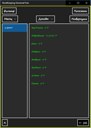 Программа для ведения личной бухгалтерии. Основные функции: Вы можете просматривать различные виды отчетов. Вы можете просматривать статистику. Вы можете подсчитать сумму для каждой категории доходов и расходов. Вы можете подсчитать общий доход, общий расход. Вы можете вести балансы доходов и расходов. Вы можете просматривать события. Вы можете настраивать категории доходов и расходов, источники, группы, балансы.