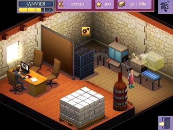 At start, you buy a wine “Château” in the Bordeaux area. You will have to manage your estate, buying tools and machinery and hiring employees with different qualifications in order of making the best possible wine to sell. Every professional function has a short explanation. Deeper information on every job is available through an internet link to videos and files. The game covers a whole year. Game time ratio is 1 week every 2 minutes of real time, so the game can be finished in less than 1 ½ hour and started again to improve the score. Score is a combination of amount of money (earned selling the production) and reputation of the “Château” (result of the care the player took of the estate). Gameplay is based on a sequence of tasks to be fulfilled in a limited time. Random climatic incidents (hail and snow) can happen.