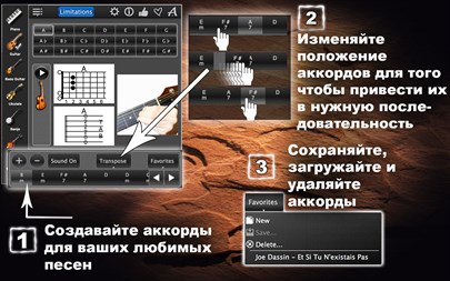 Приложение поддерживает как правшей так и левшей. Вы можете собирать аккорды в последовательности для песен или для тренировок. Вы можете изменять порядок следования аккордов в вашей последовательности. Вы также можете транспонировать всю последовательность аккордов вверх или вниз, что бы лучше адаптировать её под свой вокальный диапазон. Если вы планируете использовать последовательности снова и снова то их можно сохранять в Избранное. Наслаждайтесь Chords Maestro Base! Загрузите его сейчас!