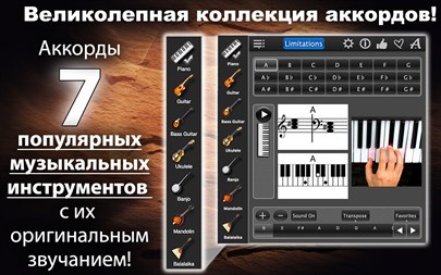 Chords Maestro Base покажет аккорд в виде музыкальных нот, диаграмм, а также фотографии с положением пальцев на инструменте. Если вы хотите переключиться на другой инструмент, то просто нажмите на его изображение!