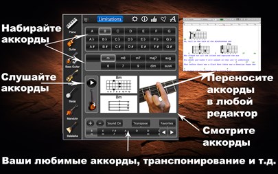 Это бесплатное приложение покажет мажорные аккорды для 7 музыкальных инструментов: фортепиано, гитара, бас-гитара, укулеле, банджо, мандолина и балалайка. Выберите нужный инструмент, затем аккорд и послушаете как он звучит!