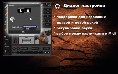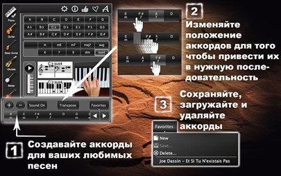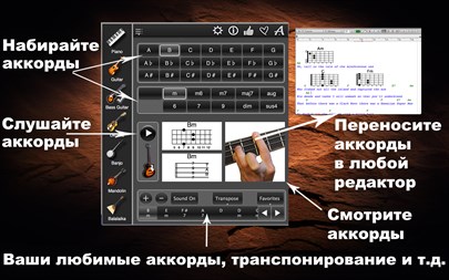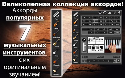 БЕСПЛАТНО пробуйте 1 день! Используя эту великолепную коллекцию аккордов вы сможете играть сразу на 7 популярных музыкальных инструментах (фортепиано, гитара, бас-гитара, укулеле и т.д.) и абсолютно без опыта ! Приложение содержит все необходимые аккорды для сопровождения любых песен ! Все музыкальные инструменты, в приложении, связаны друг с другом, что дает уникальную возможность перевода аккордов одного инструмента в другой ! Программа имеет ясный, простой и интуитивный в использовании интерфейс. Вы можете: - Посмотреть аккорды в виде нот, клавиш, в струнном представлении, в TAB-представлении и в виде фотографий, - Прослушать выбранные Вами аккорды в оригинальном звучании инструмента, - Перетащить их изображение в редактируемые Вами документы, - Создать последовательности аккордов для ваших любимых песен, а так же записывать, удалять и загружать их, - Избежать пения голосом гномика, проведя транспонирование аккордов в удобную для Вас тональность, - и наслаждаться от создаваемой музыки !