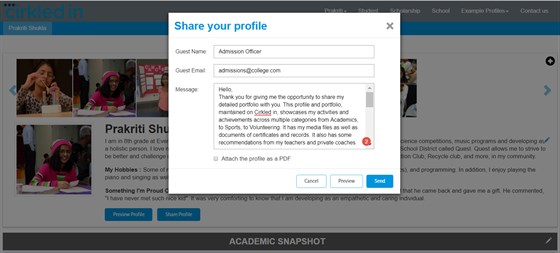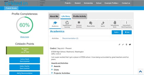 Cirkled in is a secure, award-winning 21st-century digital portfolio platform for students to showcase themselves in the best possible way and increase their success rate. It is designed to compile students’ entire school life achievements in seven categories from Academics to Sports to Volunteering - both inside and outside school. With this holistic portfolio, students get matched with their best-fit colleges and universities. Students can also share their profile securely for ANY application, such as internships, summer jobs, scholarships etc., and increase their success rate. No more losing certificates or forgetting what you did in summer after 9th grade!